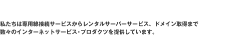 会社案内 私たちは専用線接続サービスからレンタルサーバーサービス、ドメイン取得まで数々のインターネットサービス・プロダクツを提供しています。
